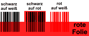 Tipp: Für eine erste Abschätzung, was möglich ist, drucken Sie die gewünschte Farbzusammenstellung auf einem Farbdrucker mit der Referenz eines schwarz-weißen Codes aus. Sie benötigen hierfür eine rote Kunststofffolie (Büchereinband für Schulbücher etc.) und legen diese 2-3 fach zusammen und dann über den Code (siehe Bild unten).